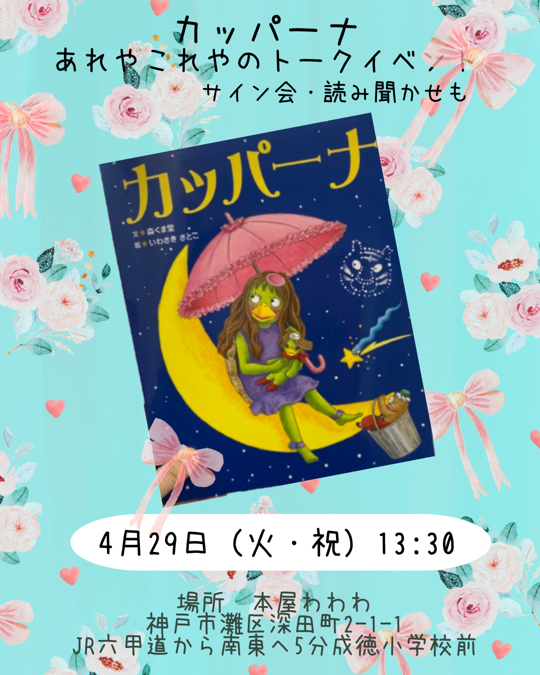カッパ界に生まれたニューヒロイン、心配性の女の子、カッパーナ。なんと!生みの親である作家の森くま堂さんが本屋わわわに来てくださり、あれやこれやとお話してくれます。
